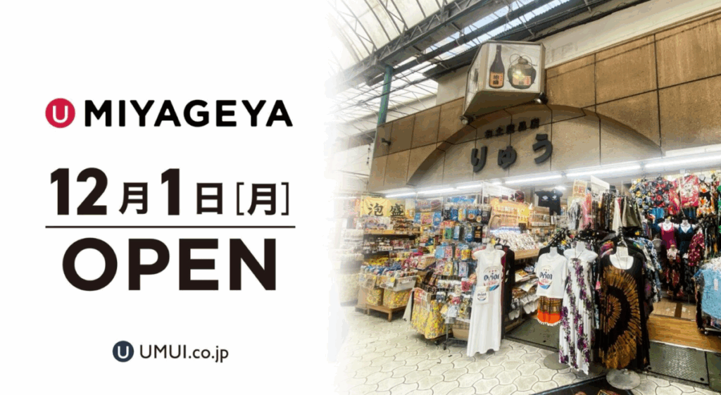 株式会社UMUI(本社:沖縄県那覇市)は国際通りから公設市場に続く“市場本通り”の沖縄県那覇市松尾2丁目8-28にて観光土産品を取り扱うセレクトショップ「MIYAGEYA」の1号店を2025年12月1日にプレオープンします。