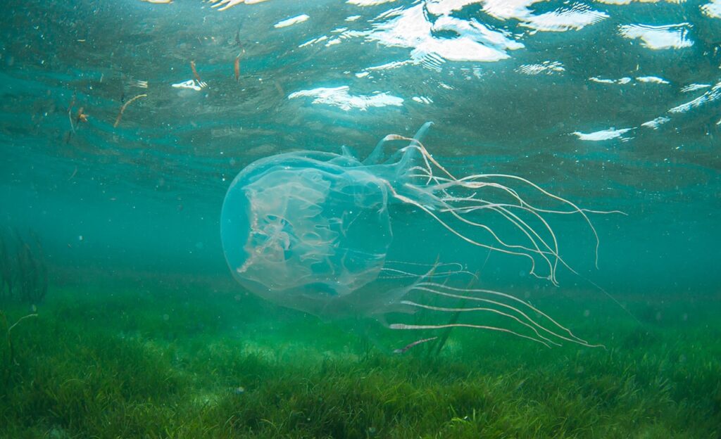 沖縄の海にはハブクラゲやカツオノエボシなど、注意が必要な生物がいます。見つけても触らず近づかないことが大切です。