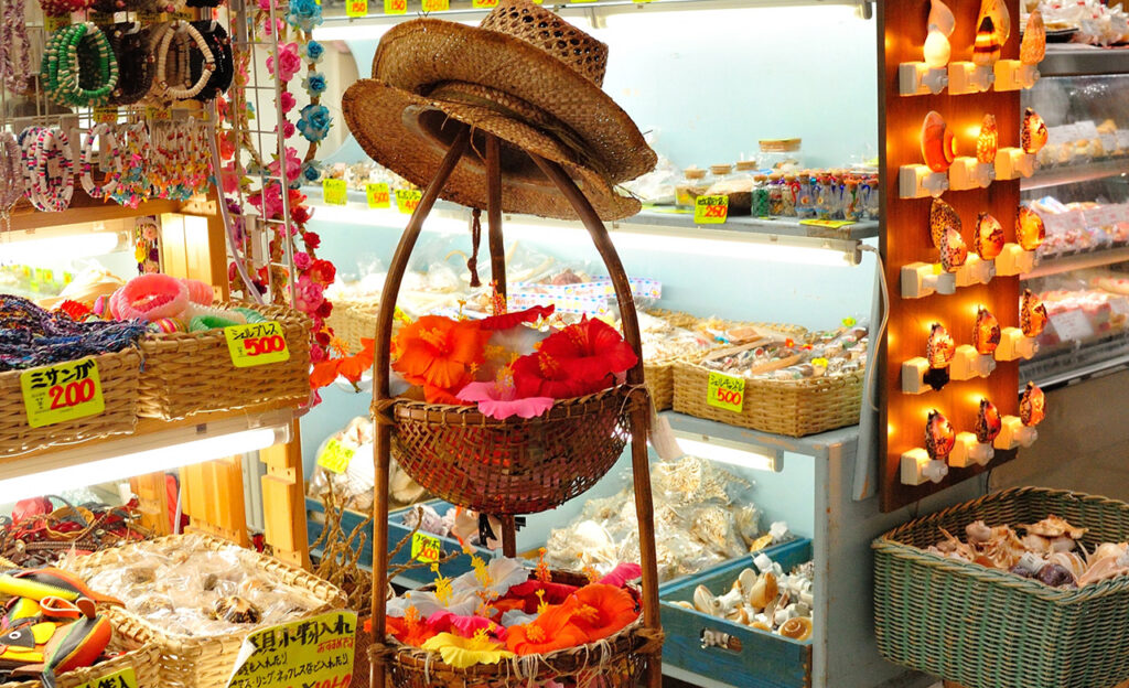 市場本通りは、お土産店が豊富にそろうショッピングスポットでもあります。昔ながらの定番土産店から、センスの光る新しいスタイルのお店まで幅広く並んでいます。沖縄らしいアイテムをじっくり選びたい方にもぴったりの通りです。