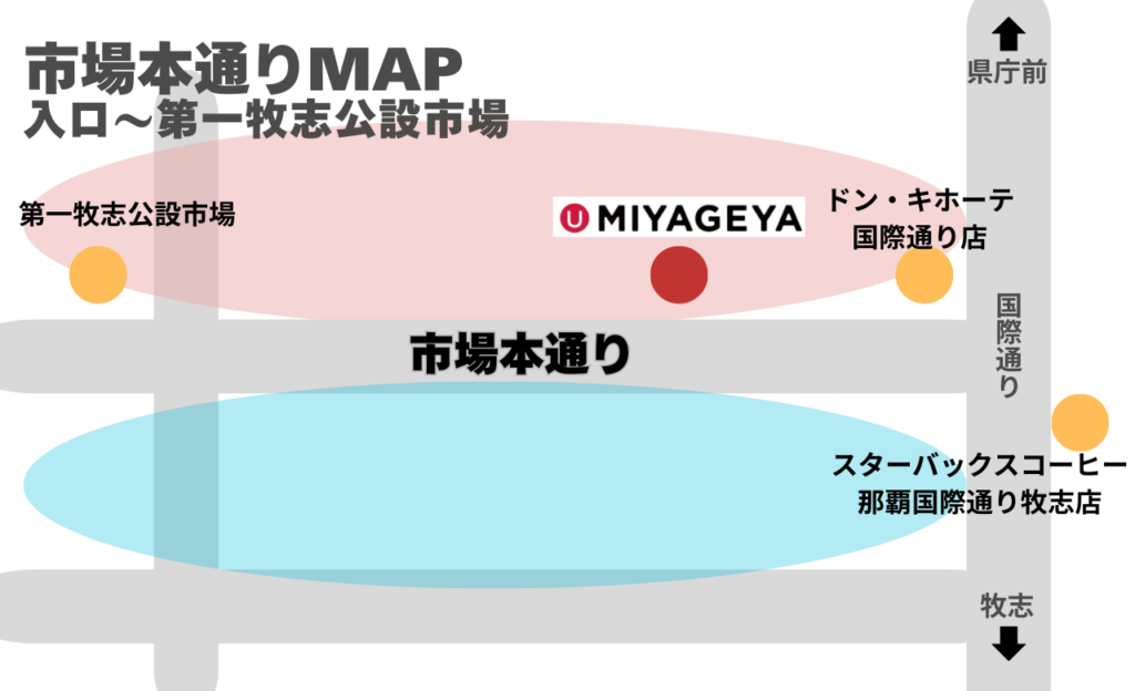 一緒に市場本通りを散策している気分で読み進めてみてくださいね♪まずは国際通りを背にして右側の通り(上記画像の赤ゾーン)からご紹介していきます!