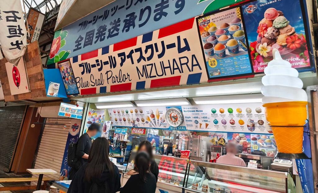 パーラー 水原店は、沖縄旅行の定番「ブルーシールアイスクリーム」を販売しているパーラー。店舗前にはテーブルが数台とベンチがあり、小休憩がてらアイスをいただくことができます。塩ちんすこうや紅芋といった南国感あふれるフレーバーを食べたら沖縄に来た実感が湧いてくるはず!
