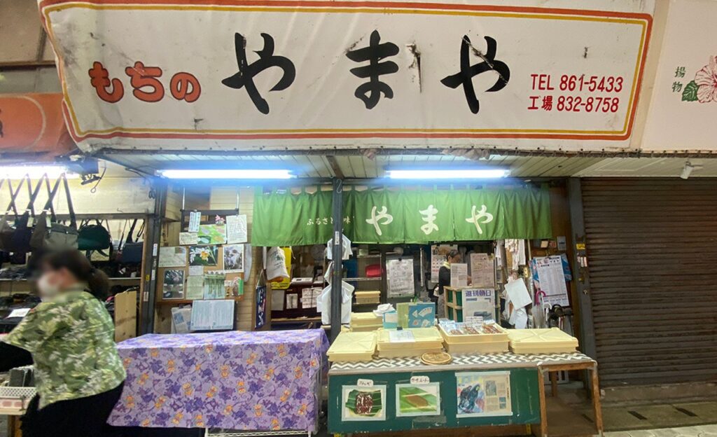 もちのやまやは、沖縄伝統のお餅「ムーチー」が購入できるお店。ムーチーは、月桃の葉っぱにお餅を包んだ香り高いスイーツ。買ってすぐ食べられるので、食べ歩きにもおすすめです。
