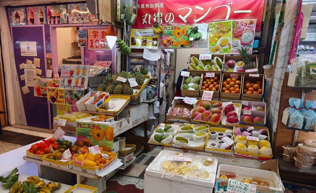 丸得果物店は、沖縄らしい南国のフルーツを扱う果物店。マンゴーや島バナナ、スターフルーツなど目にも鮮やかなフルーツが並んでいます。食べ歩きに便利な「スティックパイン」も、リーズナブルな価格で手に入りますよ。