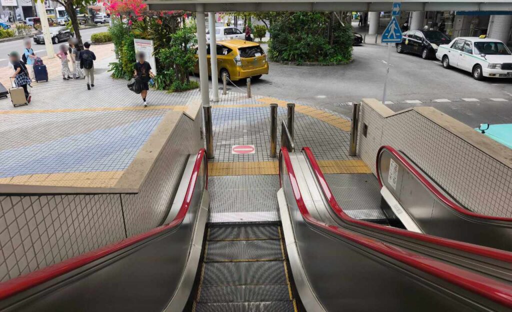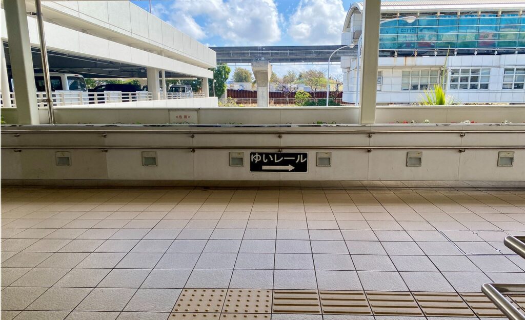 出口を出ると、屋根付きの歩道橋を通ってゆいレール駅へそのままアクセスできます。外の道路を歩く必要がなく、雨の日でも濡れずに移動できますよ。