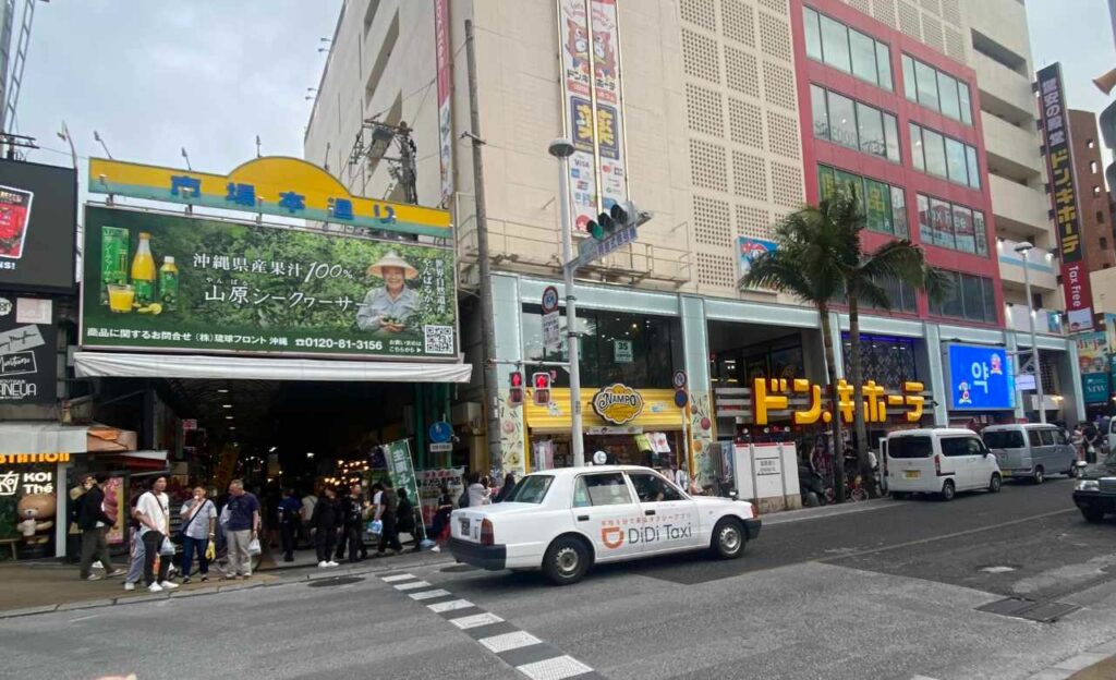 県庁前駅からドン・キホーテまでは約1kmの距離で、ゆっくり歩くと20分弱かかります。ドン・キホーテの隣に「市場本通り」のアーケード入り口が見えたら、そこからMIYAGEYAまでの道のりは牧志駅からのルートと同じです。