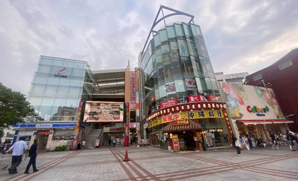 駅から出て目の前の交差点を左折したら、国際通りの入口に到着します。このまま数分ほど、国際通りの街並みを楽しみながら進みましょう。道中に見えてくるのは、てんぶす那覇という複合文化施設。工芸品の販売店やコンサートホールを完備しています。那覇市観光案内所では、充実した観光情報を得られます。