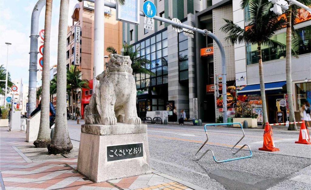 交差点を渡ると国際通りの入口に到着します。道路の両サイドにシーサーがお出迎えしてくれるので、ぜひここで1枚記念写真を撮りましょう!