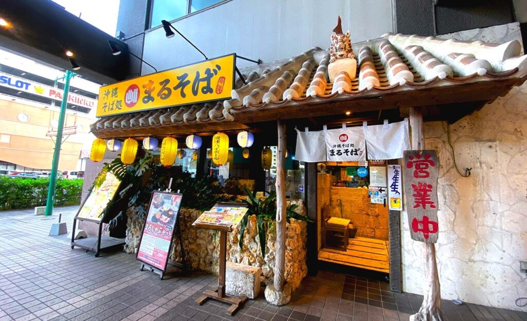 まるそば(とまりん店)は、沖縄そばを中心とした沖縄料理を楽しめるお店です。素そばはなんと300円!濃厚な白湯スープともちもちの太麺が特徴で、船旅前の腹ごしらえにもぴったりです。