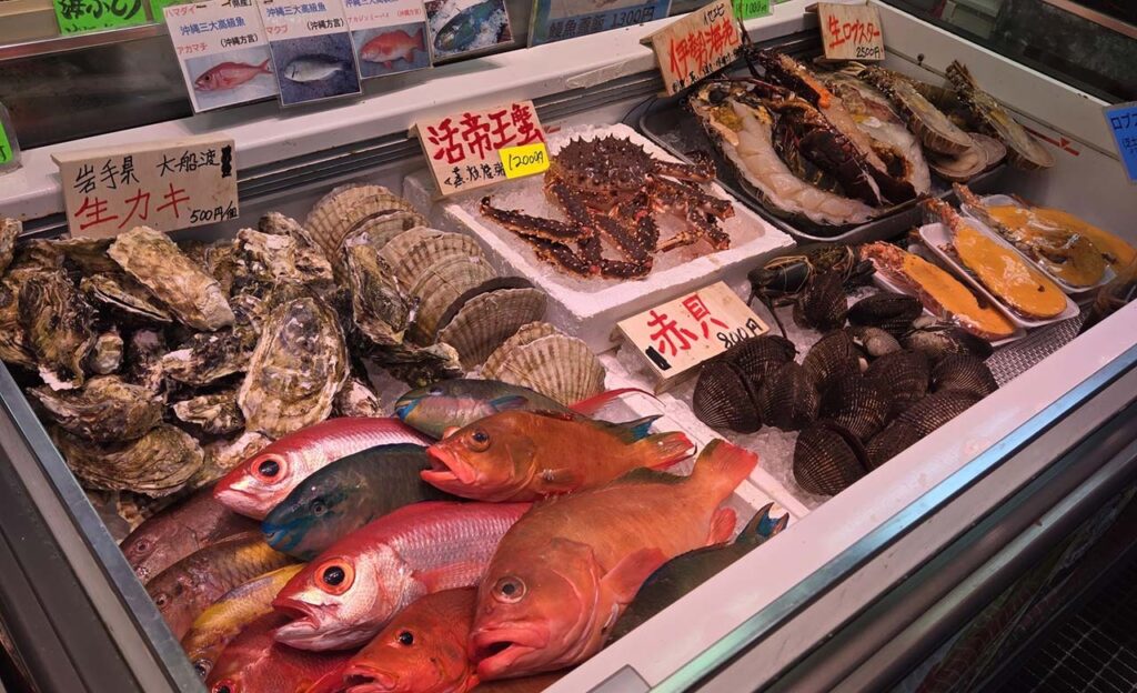 泊いゆまちは、泊漁港に隣接する鮮魚市場。とまりんから徒歩圏内にあり、沖縄の新鮮な海の幸を気軽に楽しめるスポットです。