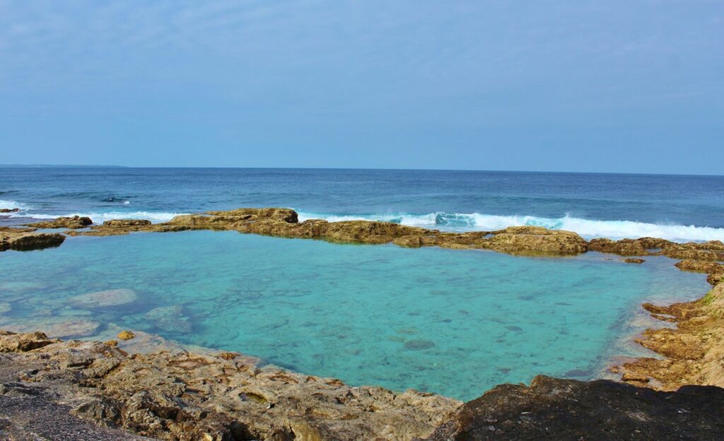 南大東島には岩場に造られた「塩屋プール」と呼ばれる天然の海水プールがあり、遊泳を楽しむこともできます。潮の満ち引きによっては、熱帯魚やエビが流れ入ってくることもあり、自然のプールはワイルドな魅力が満載です!