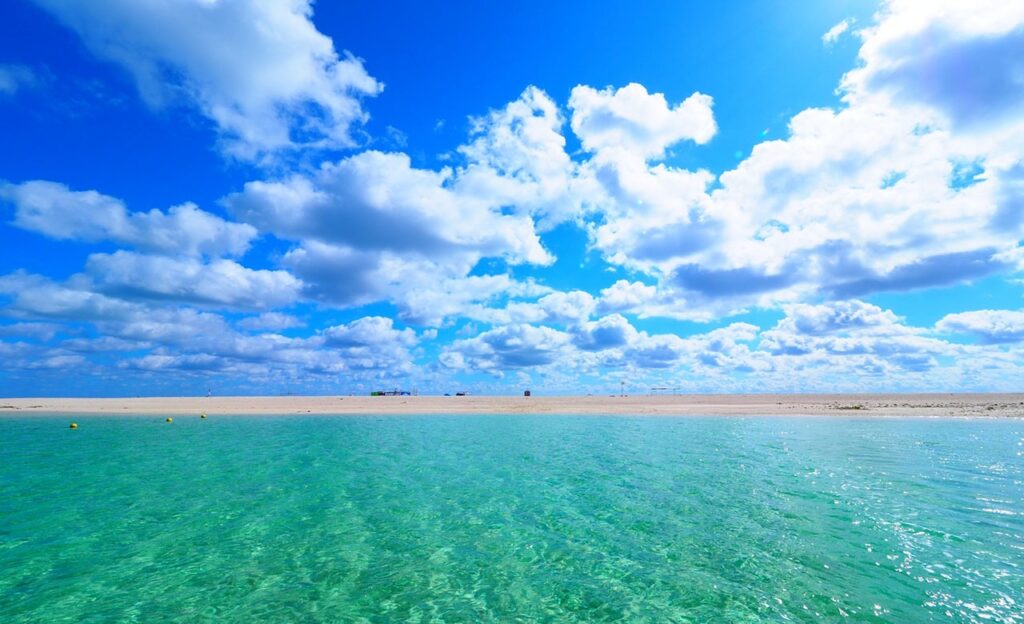 久米島といえば、白砂だけでできた真っ白な砂浜「はての浜」が必見スポット。エメラルドブルーの海に囲まれた絶景のロケーションで、海水浴やシュノーケリングなどのマリンアクティビティを楽しむことができます。
