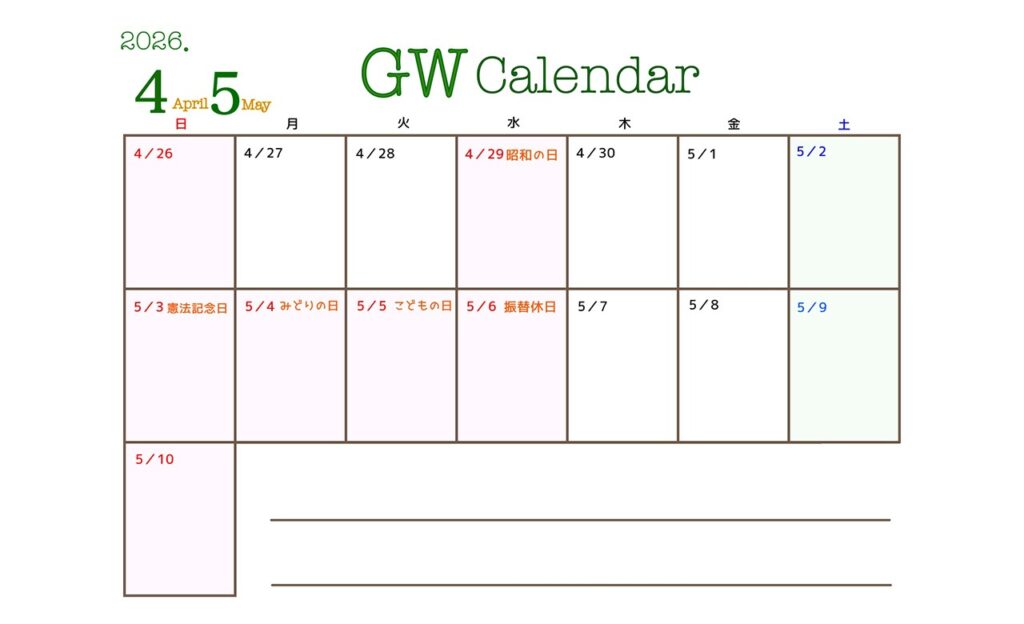 今年も待ちに待ったゴールデンウィークの時期が近づいてきましたね。2026年のゴールデンウィークは、5月2日(土)〜5月6日(水)の5連休に、4月29日(水)の単独の祝日を合わせた6日間です。中日の2日間を活用すれば8連休、さらに前後に有給を組み合わせれば最大12連休も可能です!