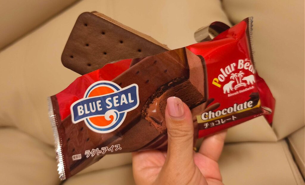 ポーラーベアーは、沖縄で人気のアイスブランド・ブルーシールが手がけるアイスサンド。ブルーシールといえばカップアイスのイメージがありますが、実はこのポーラーベアーも、販売開始から60年以上続くロングセラー商品です。ふんわりとしたココアビスケットで濃厚なアイスをサンドした、食べ応えのある一品です。