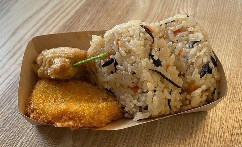 セブンイレブン・沖縄のじゅーしーおにぎりは、豚肉の煮汁で炊き上げ、肉の旨味がしっかりと感じられます。唐揚げとコロッケが付いてお得感もばっちり。