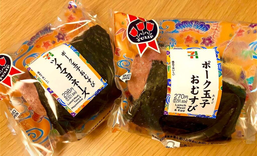 沖縄の定番フードであるポーク玉子おむすび。セブンイレブンの商品は、沖縄仕様のパッケージが印象的です。沖縄の伝統的な模様である「ミンサー柄」がデザインされており、見た目からも沖縄らしさを感じられます。