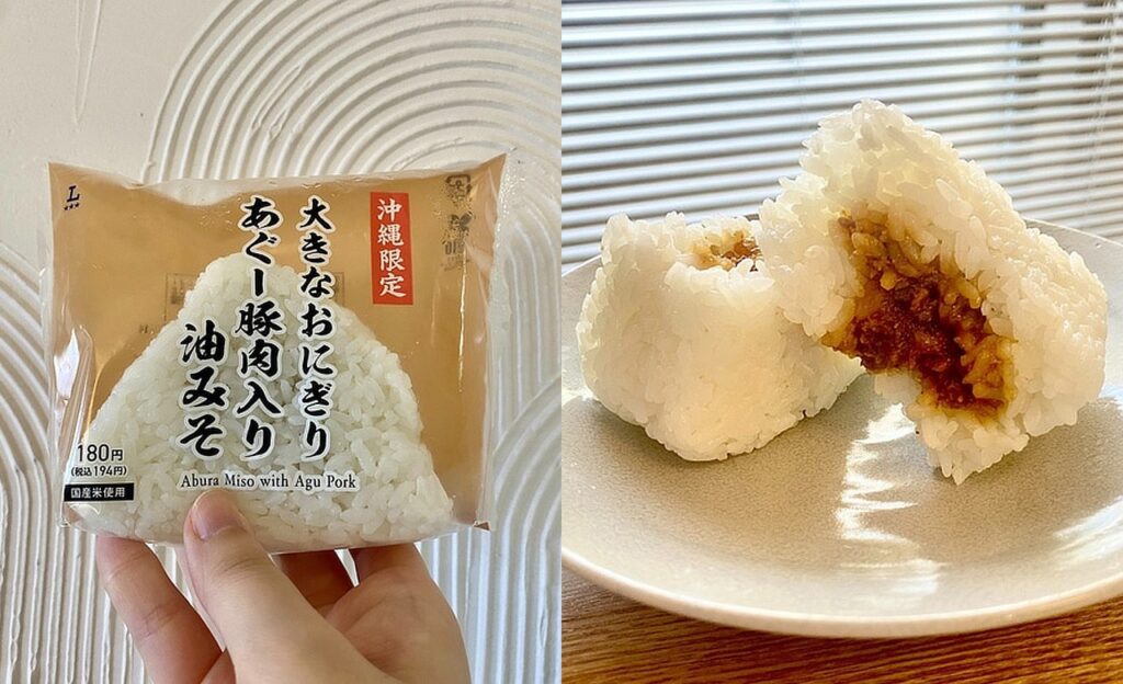 写真では伝わりにくいですが、結構なサイズ感で、持つとずっしりとした重みが感じられます。ローソンの油みそおにぎりは今回初めて食べましたが、しっかり甘めの味付けで、子どもにも好まれそうなやさしい味わい。あぐー豚が使われている点も贅沢感があっていいですね◎